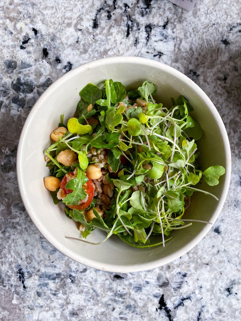 Cook the farro if you haven’t already: bring 1.5 cup water and the farro to a boil, then reduce heat to low and cook for about 20 minutes until chewy, but not hard. Strain off any excess liquid and rinse under cold water. (I usually double this farro recipe so I can have extra salads!)