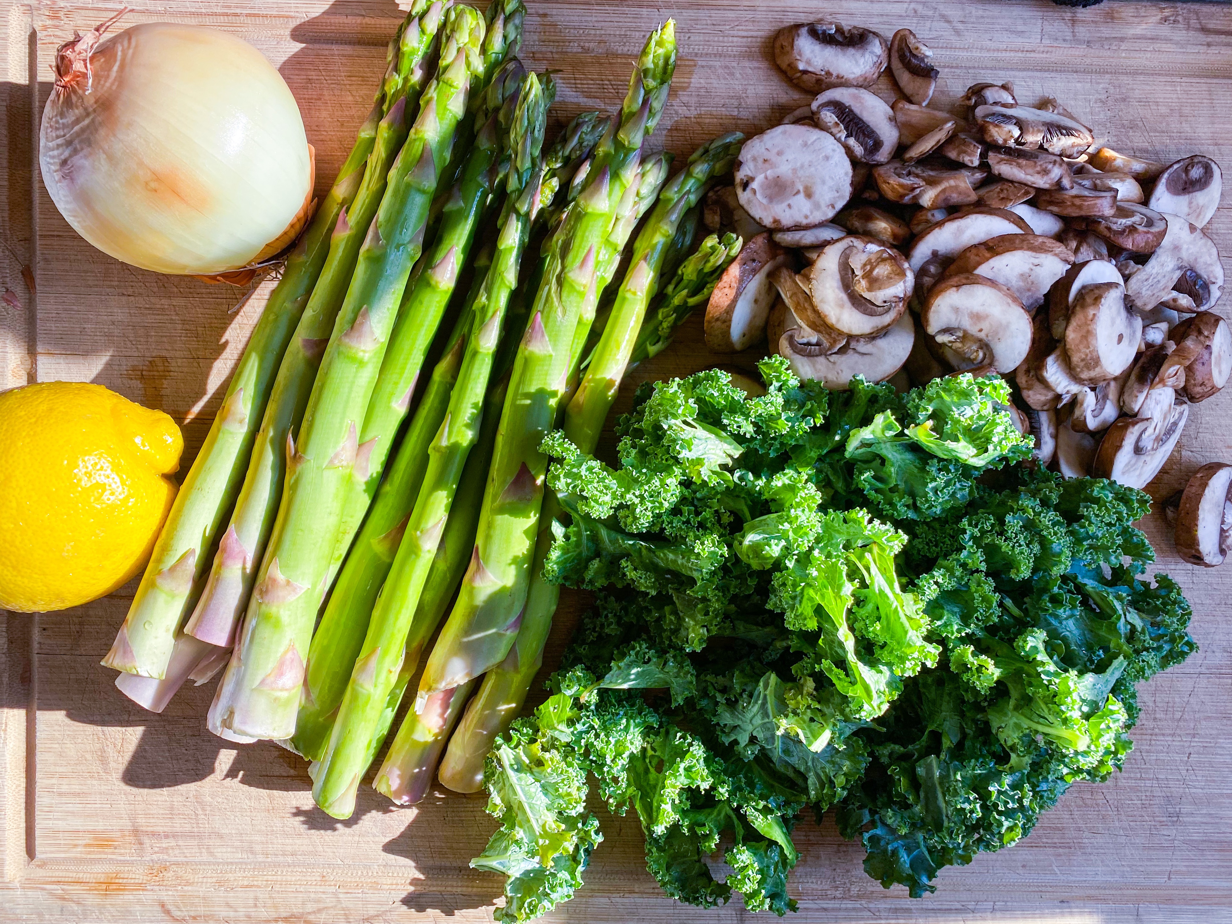 Heat 1 tbsp olive oil in a large skillet. Add the gnocchi (or diced potatoes if gluten free) directly from the package, sprinkle with a pinch of salt and few cracks of pepper, and cook until browned on both sides, about 6 mins. Remove the gnocchi and set aside. Add the remaining 1 tbsp olive oil. Add the onions, garlic, cayenne pepper, asparagus, and mushrooms. Cook for 2-3 minutes until onion softened, then add the kale and 3/4 vegetable broth, a few cracks of black pepper and salt to taste (this depends on if your broth is unsalted or not). Cover and cook for 5 minutes until kale is wilted.