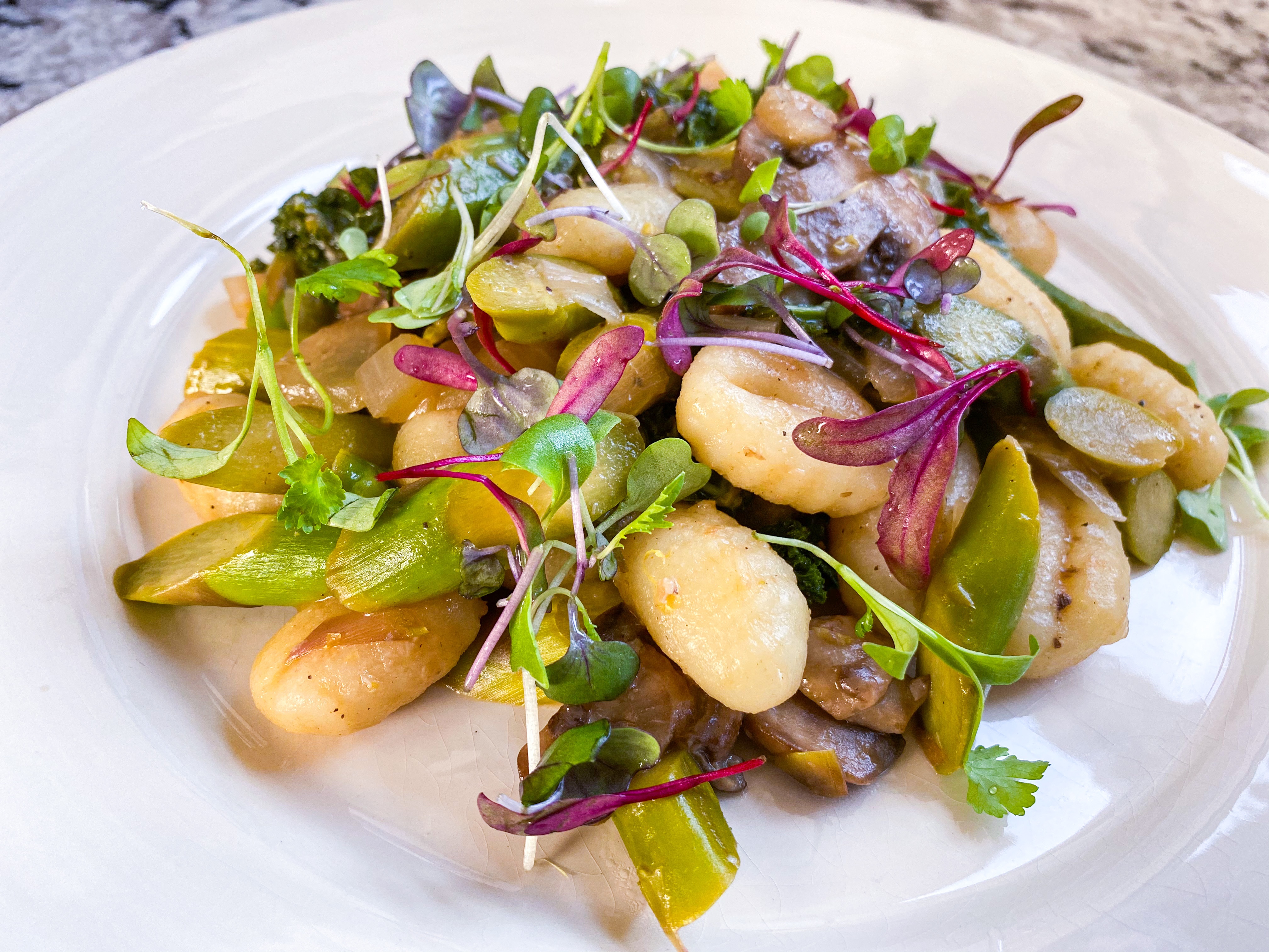 Uncover and give it a quick stir, then add the gnocchi back to the pan. (If there is no liquid in the bottom of the pan, add the additional 1/4 cup broth.) Cook for an additional 4-5 minutes or until the sauce is thickened and vegetables are cooked through. Add the lemon juice and lemon zest and stir well. Serve with a sprinkle of microgreens on top.