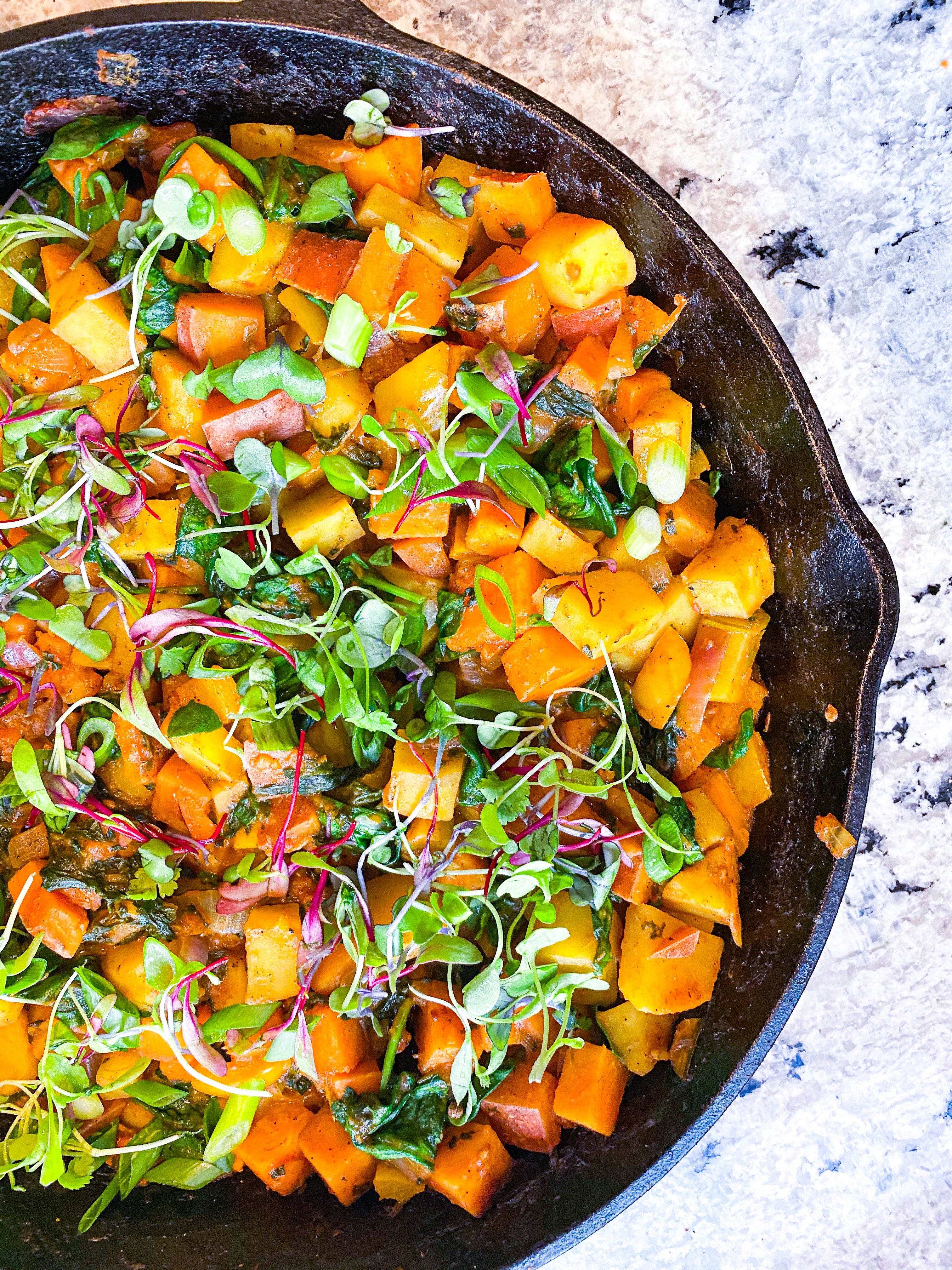 - 2 small yellow potatoes and 2 small sweet potatoes, diced