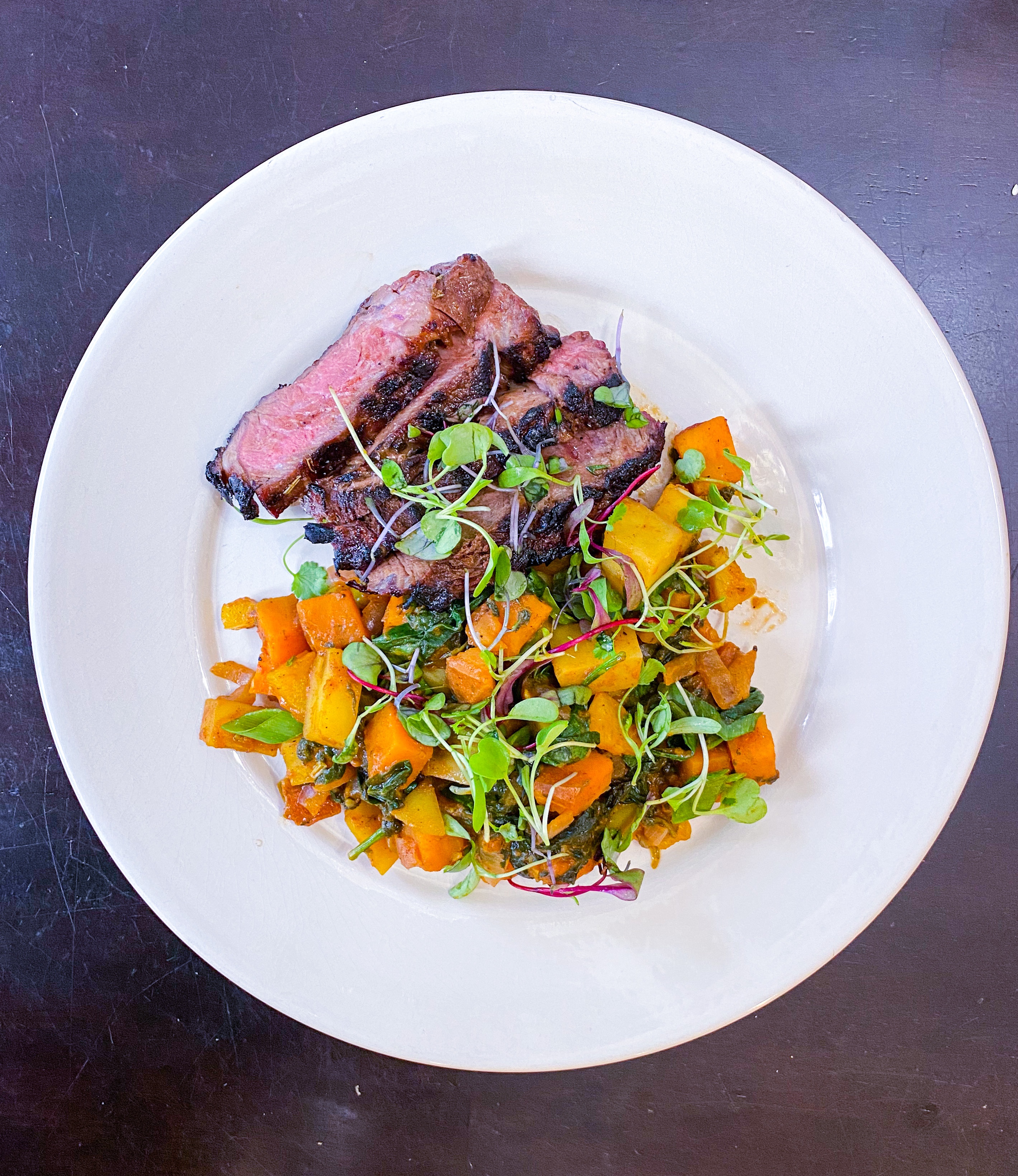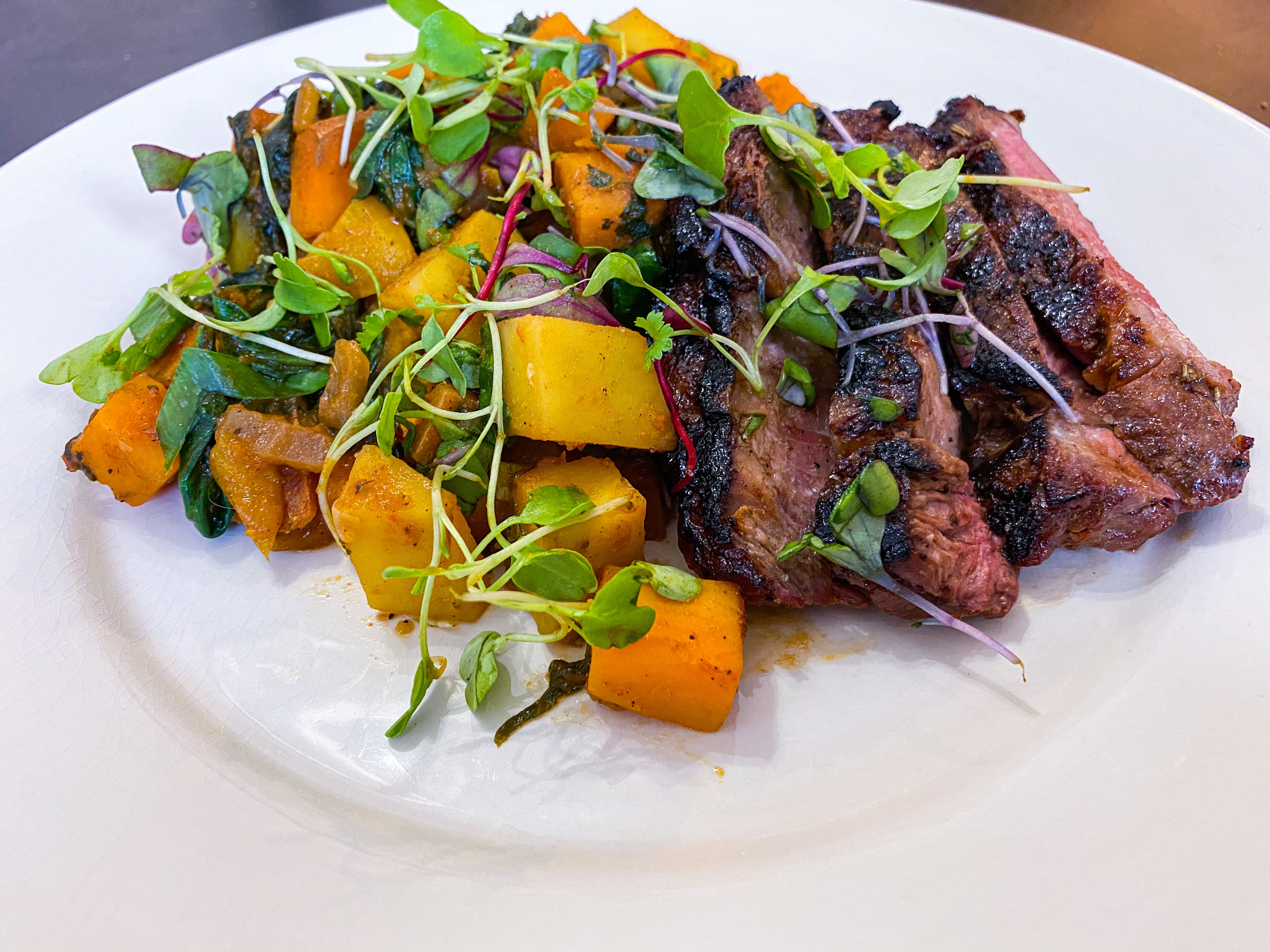When grill is at 400 degrees F, place steak on grill and shut the cover. Grill for four minutes then flip and baste, using some of the the remaining marinade. Check the temp in the largest part of the steak after another 4 minutes. It should read 145 degrees for a medium steak (adjust the temp per your preference: 125 degrees for rare and 160 degrees for well done). If not done, shut the cover and check internal temp every minute, flipping as needed to avoid burning. Remove to a cutting board, sprinkle with sea salt and let rest for three minutes until slicing. Serve potatoes with a squeeze of lemon, sliced scallions and microgreens and place the steak on the side.