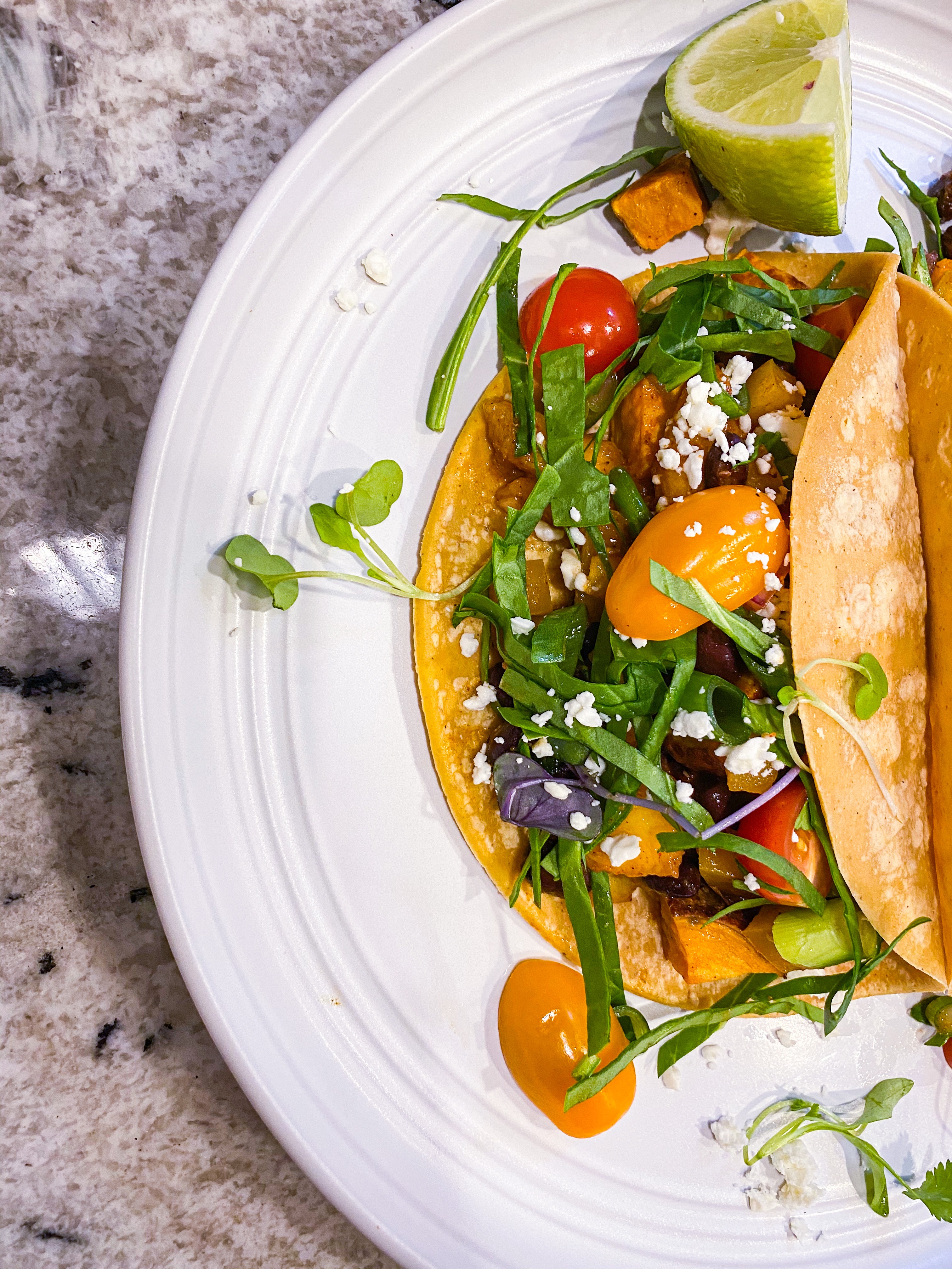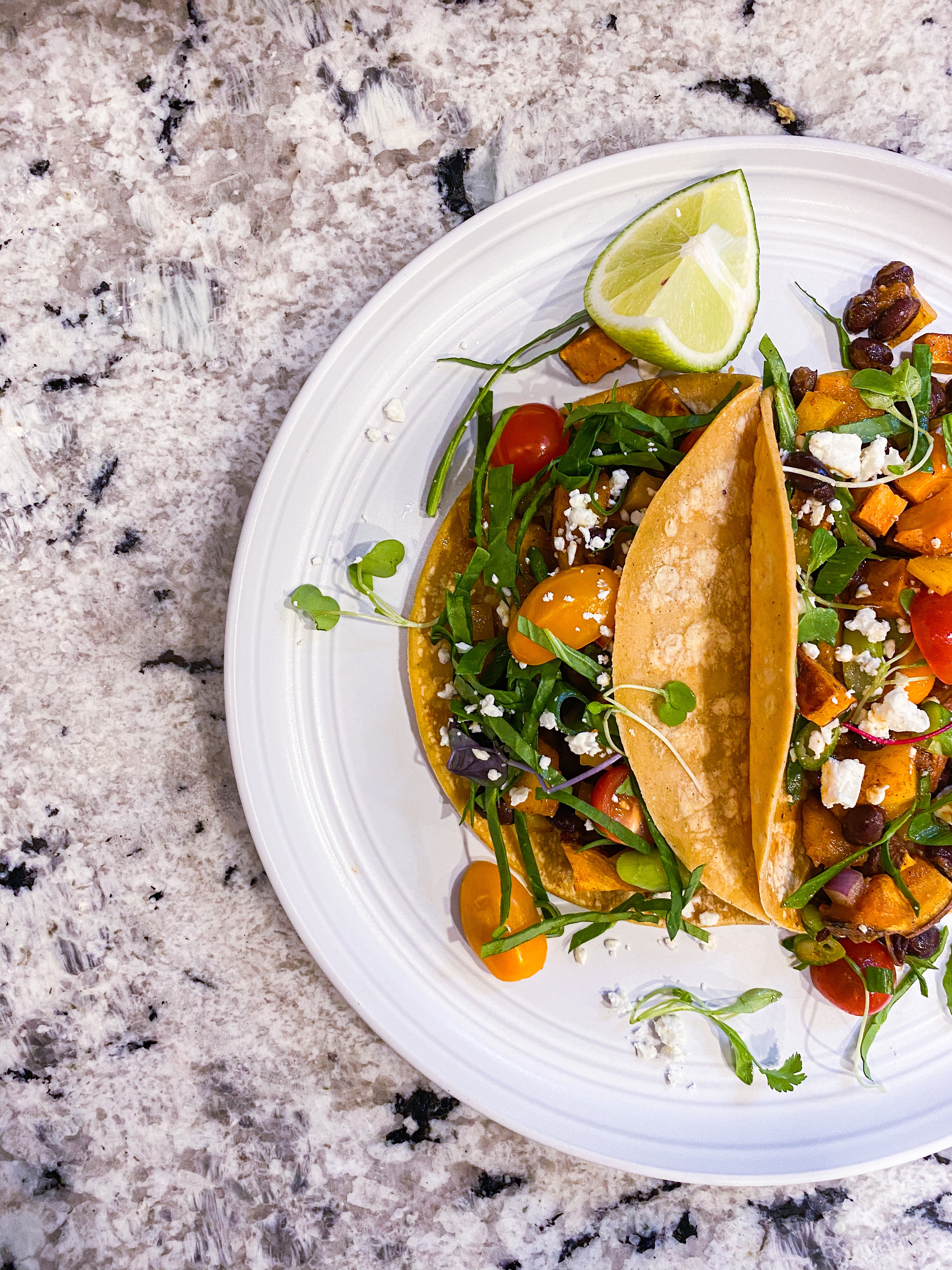 When the potatoes are done, place the tortillas in a moistened paper towel and heat in the microwave on high for 30 seconds. You can also heat directly over the gas burner to add a bit of char flavor. Fill each tortilla with about a 1/4 cup of sweet potatoes, 1\4 black bean mixture and your toppings!
