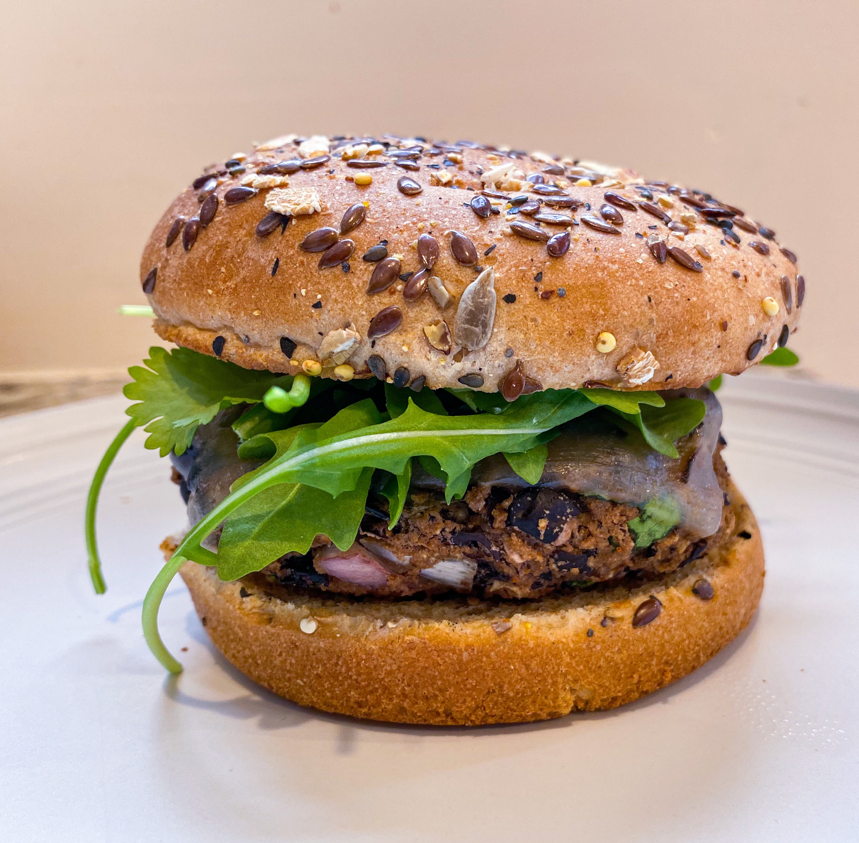 While the cauliflower is roasting, place the black beans, onion, garlic, chipotle chili powder, cumin, salt and a few cracks of black pepper in a large bowl. Using a potato masher, mash until the black beans are smashed (ok to leave some whole!). Add the egg, breadcrumbs, and cilantro and mix to combine. Form into 4 patties and brush olive oil on both sides of each patty.