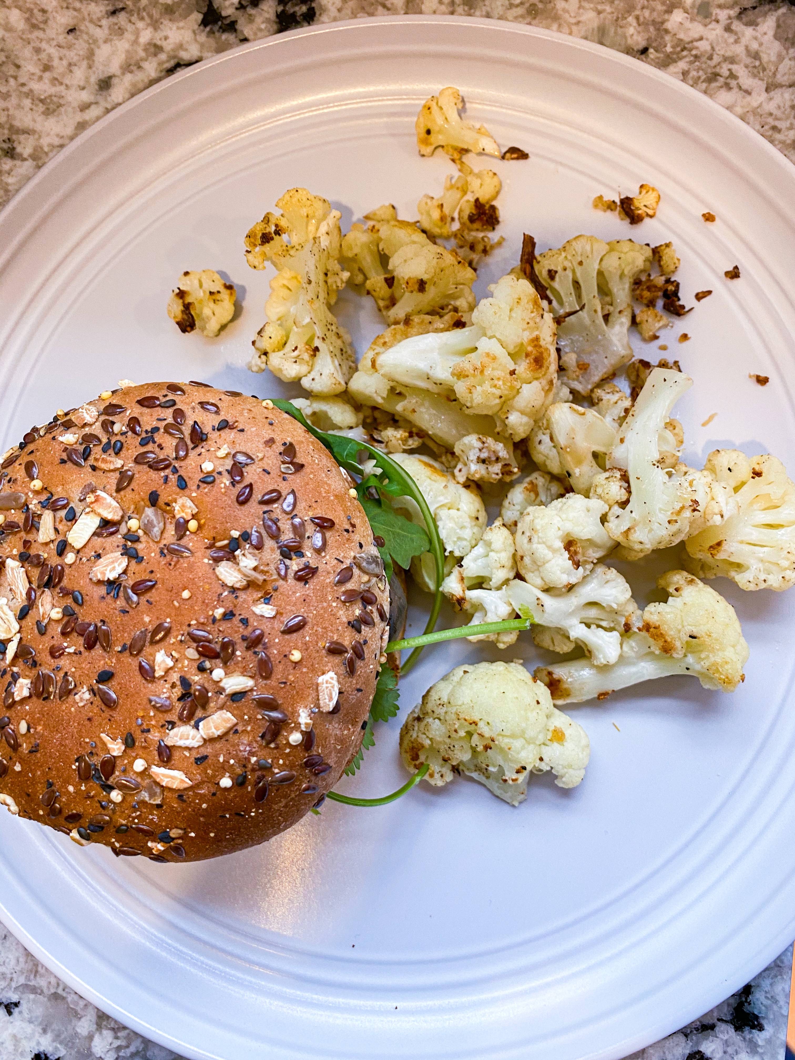 Preheat your oven to 420 degrees. Toss the cauliflower with 1 tbsp olive oil, a sprinkle of salt and a few cracks of black pepper. Place on a baking sheet and cook for about 40-45 minutes until browned, flipping once half way through cooking.