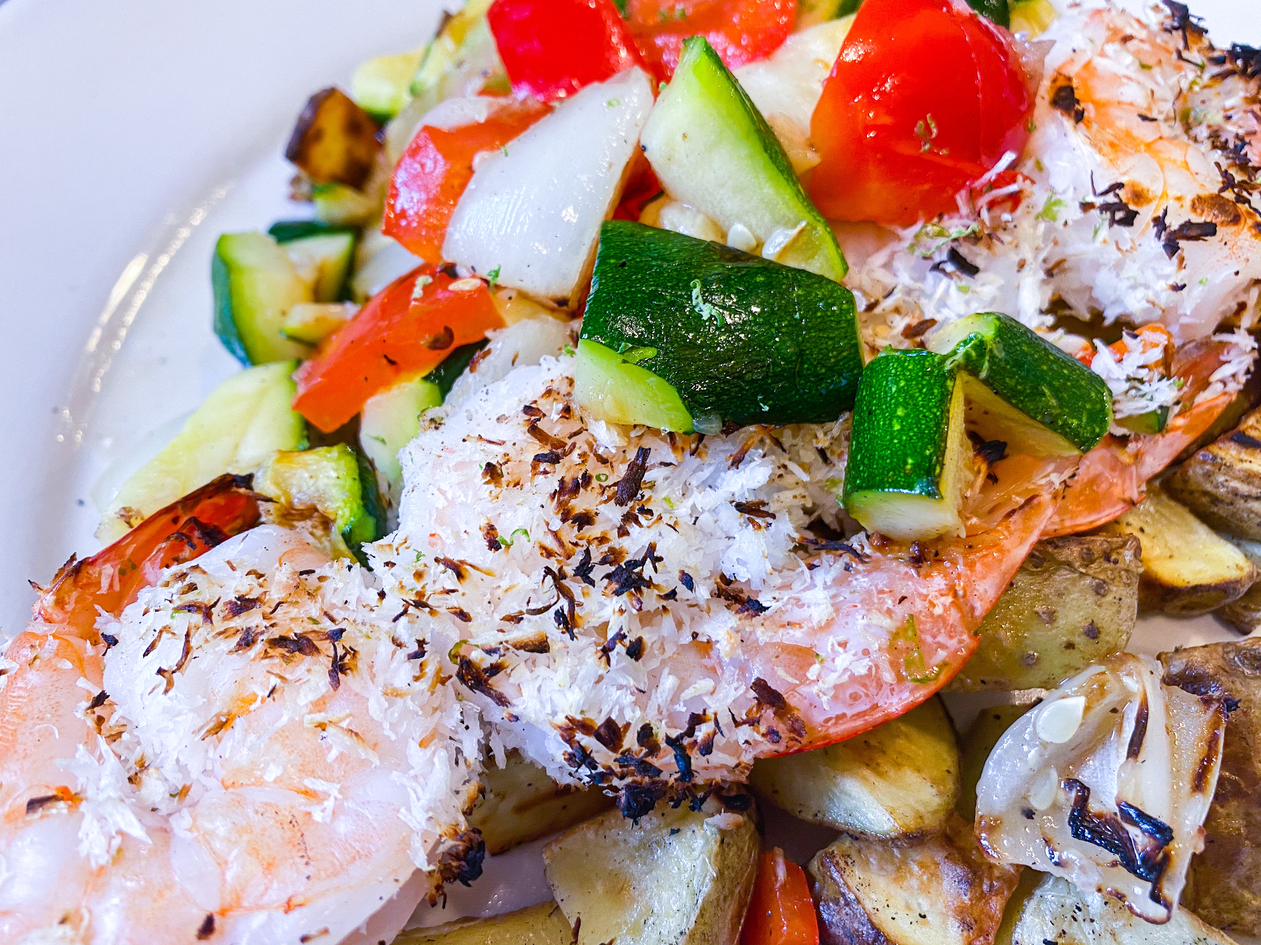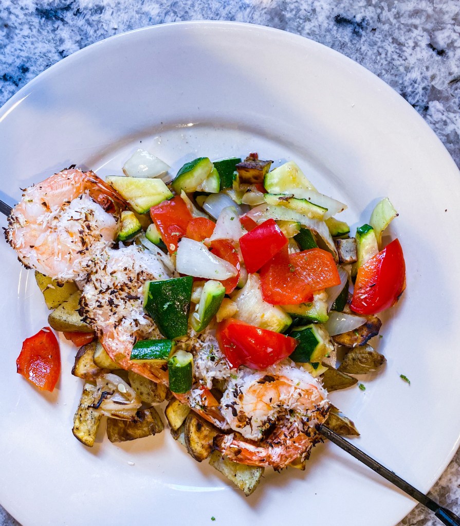 Place the vegetables in a medium sized bowl and sprinkle with seat salt. Turn the grill to medium-high (about 400 degrees). Place the vegetables on one side of the grill and the skewers on the other. Cook the shrimp for three minutes, then flip and cook for another three minutes. Shrimp are done when just firm to touch (they can over-cook quickly, so they bear close watching). Flip the vegetables after the shrimp are done and cook for another 4-5 minutes until charred (they should be a touch firm still – avoid mushy vegetables). When done, remove and chop the vegetables into small pieces. Place back in your medium-sized bowl and mix with the remaining dressing and 1/2 tsp red pepper flakes.
