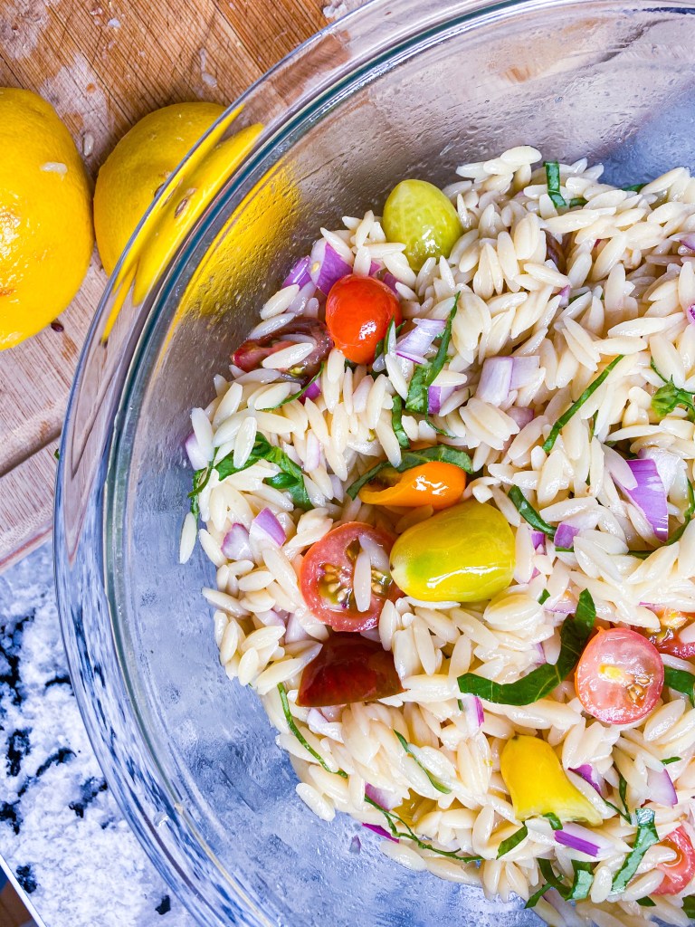 This salad is so easy and filled with fresh ingredients making it the ultimate side. It can be served either warm or cold and can be made ahead. Perfect for those warm summer lunches, barbecues, picnics or just your average weeknight – this would be the perfect complement to your Memorial Day get together! This recipe is vegetarian and done in less than 20 minutes.