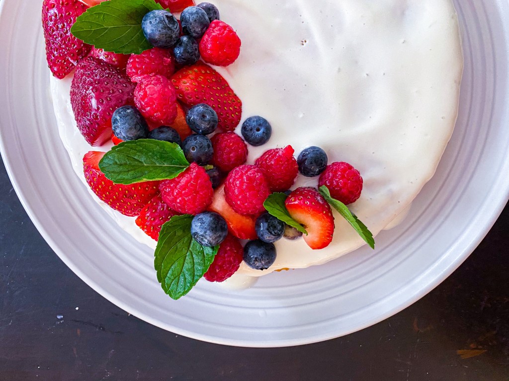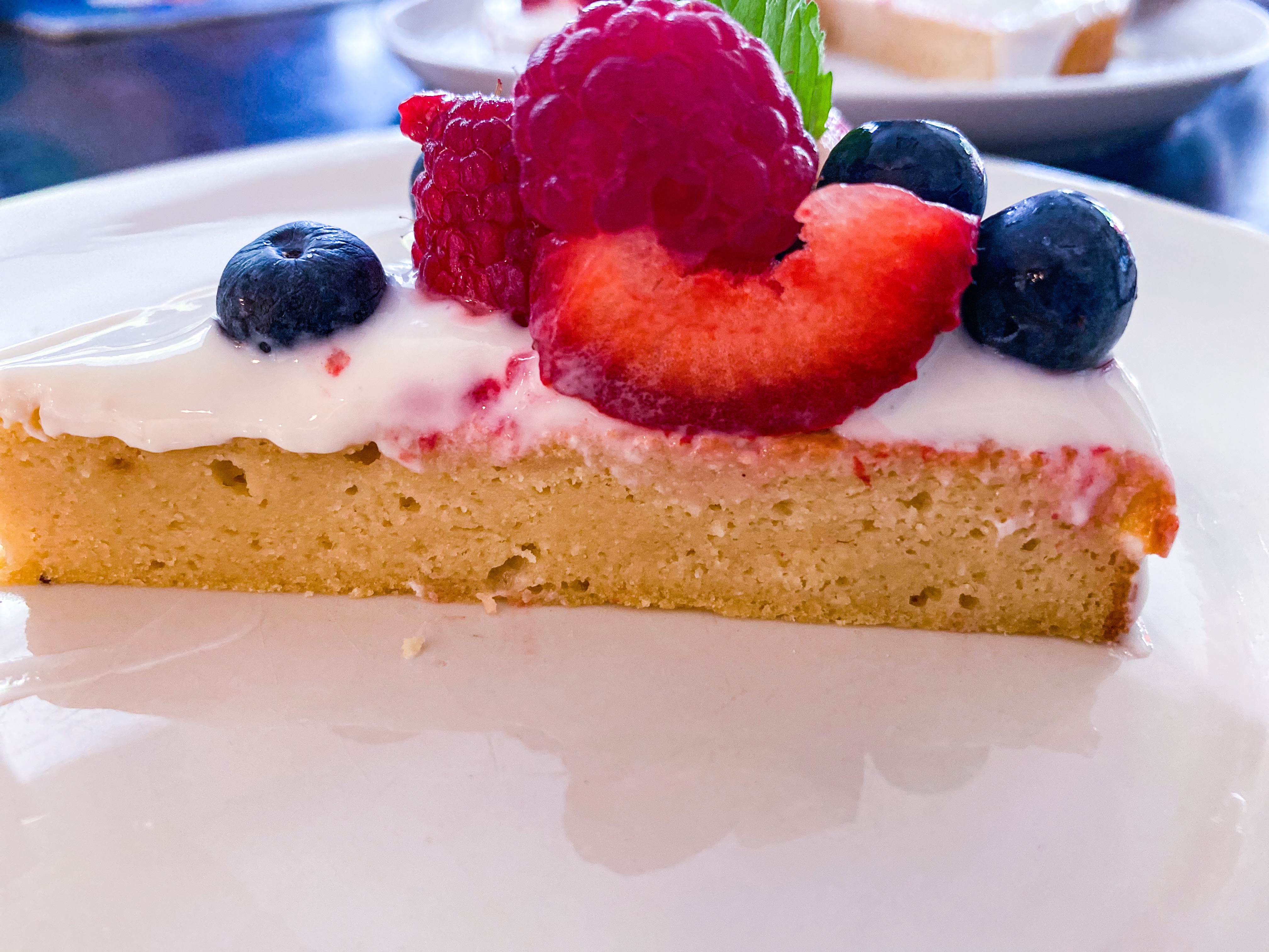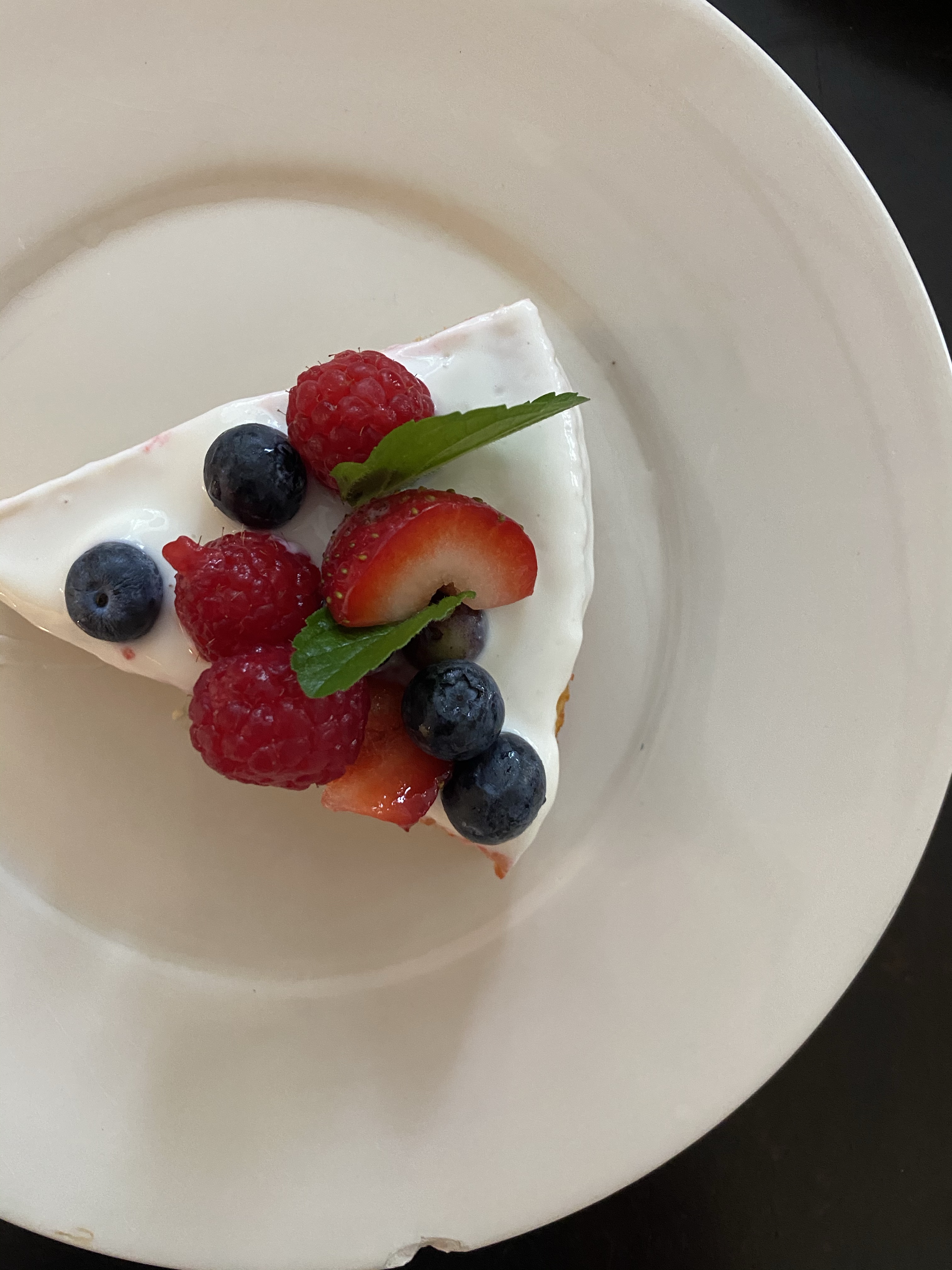 While the cake is cooking, make the honey yogurt. Mix together the yogurt, honey, lemon juice, and salt. Once the cakes are cool and you are ready to eat, spread the honey yogurt on top of the cake and push to the edges to let it drip down the sides. Top with berries and mint. Best when served immediately.