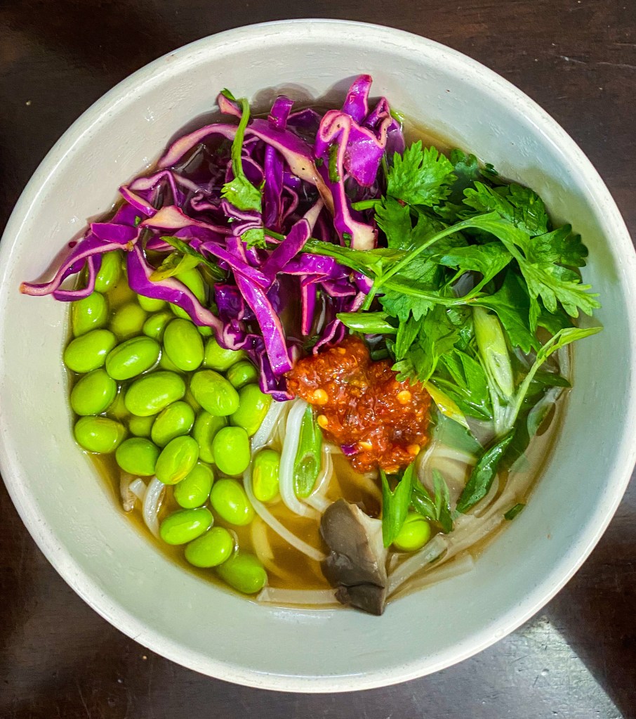 While broth is simmering, cook the rice noodles per package directions, then drain and rinse under water (important – don’t skip this step!). When broth is ready, ladle 1 cup of broth into a bowl, add some noodles and top with edamame, red cabbage, cilantro, scallions, a squeeze of lime, and chili garlic and/or hoisin sauce to taste.
