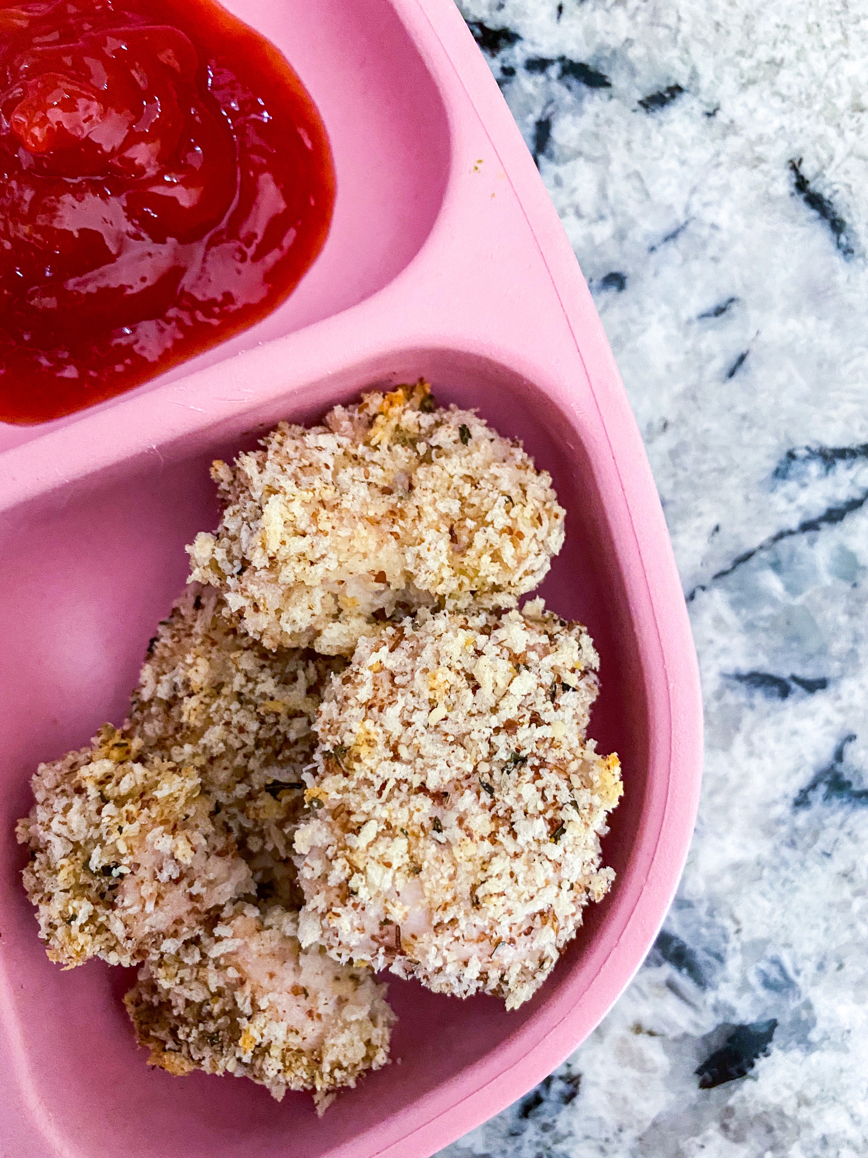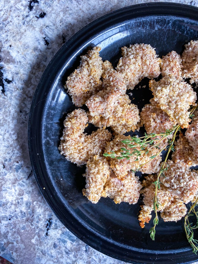 Creat an assembly line by setting your chicken next to the wet ingredient bowl, followed by the bread crumb bowl, and then your sheet pan. Dip the chicken into the wet ingredient bowl and then into the panko mixture, making sure to coat well during each step. Place on the baking sheet leaving about 1 inch between each nugget and repeat with the remaining chicken. Bake for 18-20 minutes or until an internal thermometer reads 165F.