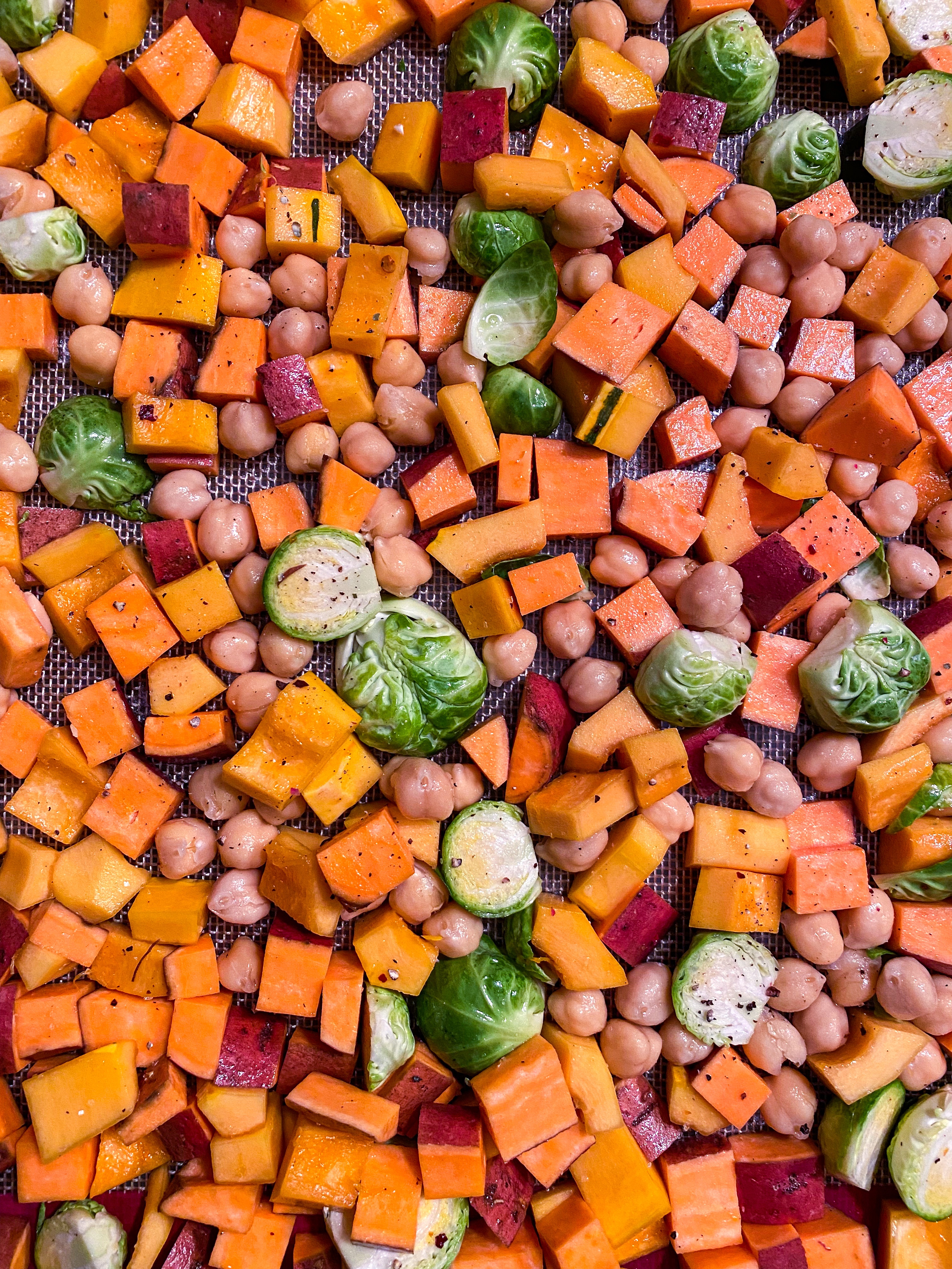 Preheat your oven to 420 degrees F. Place chopped Brussel sprouts, sweet potato, butternut squash and chickpeas in a large bowl and toss with olive oil, agave, red pepper flakes, a few cracks of black pepper and generous sprinkle of sea salt. Spread evenly across two baking sheets and bake for 40-50 minutes, turning once about halfway through.
