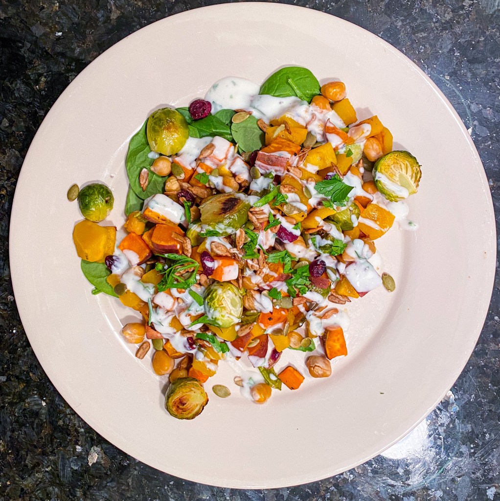 Spread 1 cup baby spinach on each plate and top with about 1 heaping cup warm roasted vegetable and chickpeas. Drizzle yogurt dressing on top and a sprinkle of dried nuts and seeds if desired (we like cranberries, sunflower seeds and pepitas). Serve immediately.