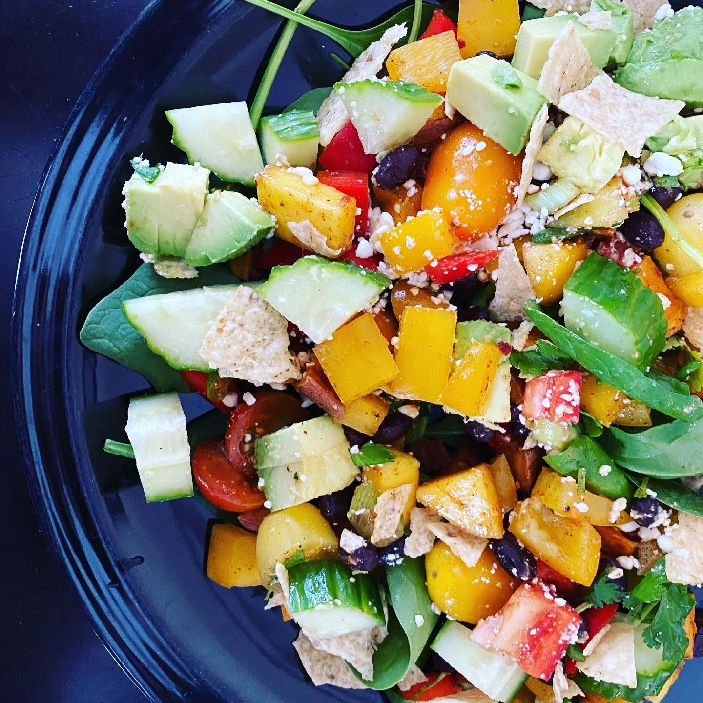Mango Black Bean Salad1 red pepper, diced1 mango, diced1 15-oz can low-sodium black beans2 limes, 1 juiced and 1 sliced into wedges1 tbsp agave or honey1 tsp chili powder1 tsp chipotle chili powder1 tsp cumin1/2 tsp garlic powder1/2 tsp sea saltBlack Pepper2 cups of baby spinachToppings1 english cucumber, sliced in quarters1 cup cherry tomatoes, halved1Continue reading “20-minute Mango Black Bean Salad”